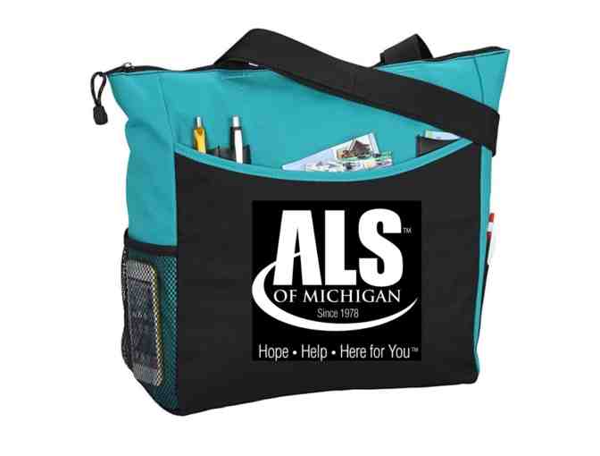 This versatile tote can hold everything you need when you’re on the go. The tote measures 14" H x 17" W x 5" D and features a zip top closure, front pocket with 2 pen and one card holder and 2 side pockets.