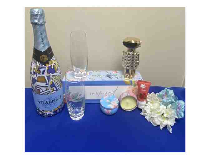 What's Included: FAME Perfume by Paco Rabanne. A Massage Envy gift certificate for a 60 minute massage. Two Candles. A travel sized hand cream. A set of 4 Fluted Champagne Glasses. A bottle of Vilarnau Prosecco.