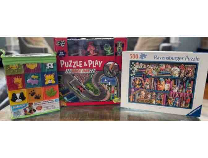 • Peaceable Kingdom Puzzle & Play: Race Day - Floor Puzzle for Kids Ages 3 and Up - Includes 3 Wooden Vehicles to Zoom Around The Race Track Puzzle for a Double Dose of Fun - Measures 26” x 36”