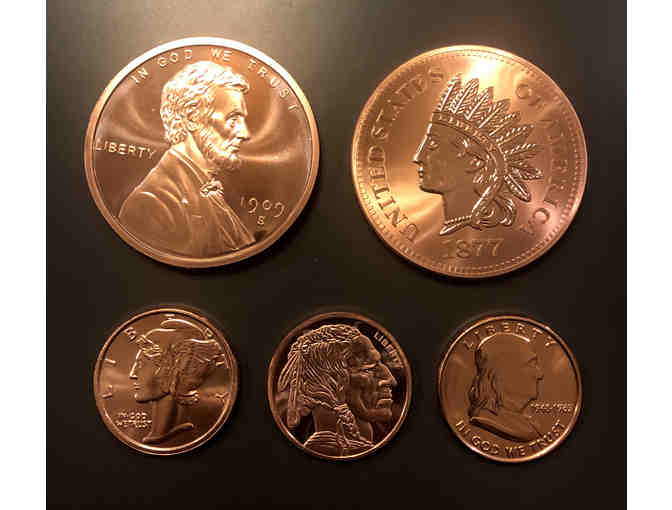 This collection includes 13 total ounces of copper and showcases a blend of oversized 5 oz rounds and standard 1 oz rounds — perfect for collectors, educators, or patriotic displays.