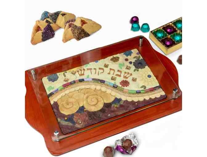 Designed by Michoel Muchnik, this impressive one-of-a-kind Challah board will be treasured for years to come. Intricate 3D mosaic is topped with tempered glass and set on a rich wooden base.
