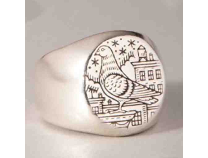A weighty silver signet ring, emblazoned with the truest New Yorker: the humble pigeon against an iconic city scape.