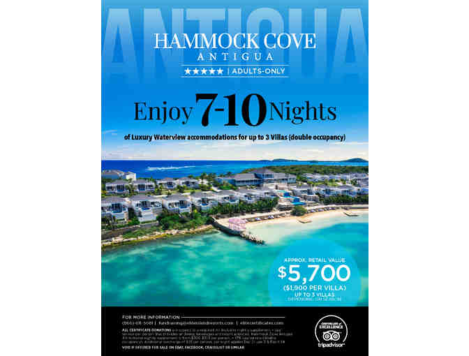 • Luxury Waterview accommodations for up to 3 villas (double occupancy) for up to 10 nights per villa, exclusively for adults. (valued up to $1,900 per room, depending on dates of travel) at Hammock Cove, Antigua.