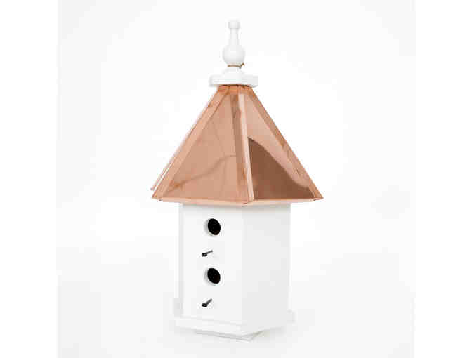Your Wooden Expression birdhouse, constructed using MDO (medium density overlay) and 16 ounce roofing copper, is fully functional and built to stay outside year round. It is suggested that nesting material be removed in the fall. Copper naturally begins to tarnish when exposed to air. This will eventually lead to a beautiful teal green patina. If you prefer to keep the copper's "new penny" look, spray with one of many commercially available sealers such as Incralac Spray.