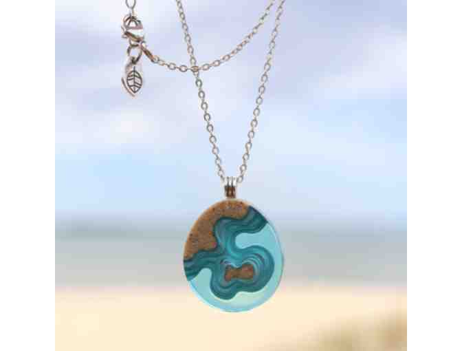 Our Promontory necklace showcases a wide tear drop shaped design, with layers that mimic the topography of a Promontory pertruding into the ocean. The necklace is carefully crafted from bonded beach sand and blue resin and dangles on an 20"/50cm cable link chain with a 2"/5cm extender. Aqua color