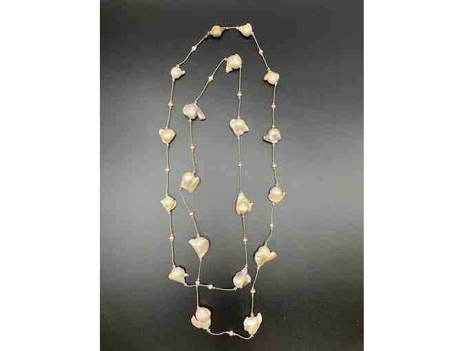 18 baroque pearls adorn this one-of-a-kind necklace strung on fine but strong silk cording. These lustrous, irregular pearls are separated with smaller pearls and crystals.