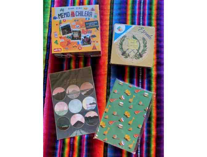 This one is for the kiddos and includes a 4pack of wooden puzzles, Guatemalan inspird memory game, a sheet of Guatemalan sickers and a small blank notebook/journal book.