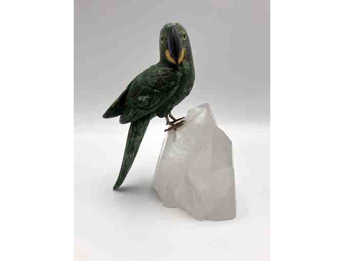Serpentine carved green parrot standing on large quartz crystal from Brazil