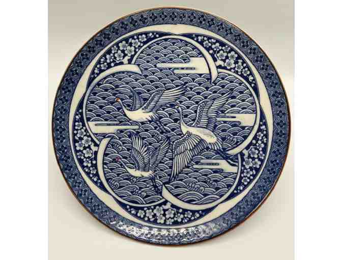 A lovely Japanese blue and white plate depicting three cranes in flight over an ocean accented by cherry blossoms and a decorative floral border. Maker's mark on reverse. This piece would make a wonderful statement piece, on the table or displayed on a wall.