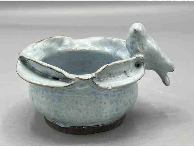 Split rim planter with solo bird perched on the edge. Drain hole.