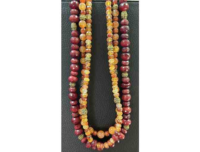 Three stranded necklace measures 8 1/2 inches long with red and orange carnelians, gold accents, and silver clasp.