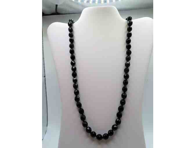 Necklace measures 18 inches long with 1/2 inch sized black crystals and a 5 point gold star clasp.