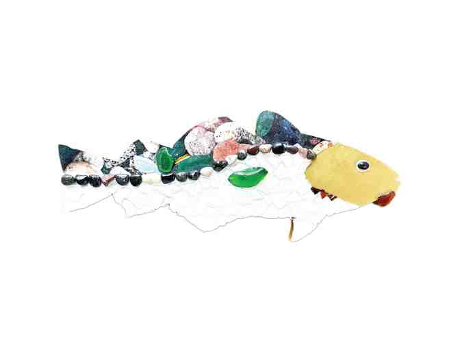 This year's golden cod features fabric and sea glass, separated by a swirling line of beach pebbles. The fabric was created with a photograph taken at the mesmerizing sea glass island in Aruba. The beach-procured pebbles and sea glass were collected in our beloved town.