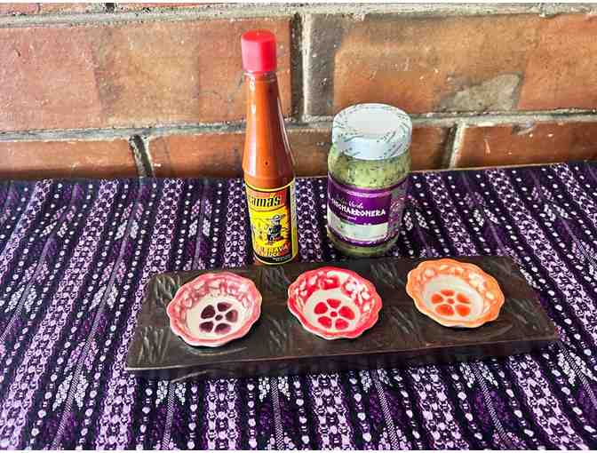 - Colorful Ceramic Dish – Nestled in the tray, the hand-painted ceramic dish showcases traditional patterns and is ideal for serving salsas, dips, or small snacks. -1 Bottle of Picamas Guatemalan Spicy Sauce – A beloved staple across Guatemala, this hot sauce brings a balanced heat and tangy flavor that complements everything from grilled meats to eggs and tamales.
