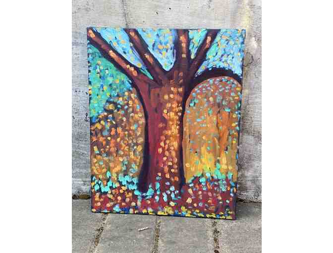 This vibrant original painting by Zak Zaikine bursts with life, color, and movement. Featuring a bold central tree with expressive, textured brushwork, Autumn Radiance invites the viewer into a dreamlike landscape where the seasons shimmer with emotion and energy. Hues of rust, gold, turquoise, and deep indigo dance together in a celebration of nature’s transformation.