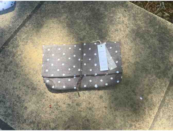 Bag measures 11.5" x 6" and is black with a white polka dot print.