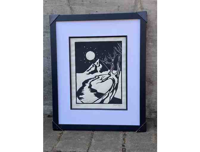 This striking black-and-white block print, titled Moonlit Path, captures a dreamlike winter landscape under a glowing full moon. Created by a talented student artist, this piece features bold, expressive lines and masterful contrast that draw the viewer into the winding path, silhouetted trees, and snow-covered peaks.