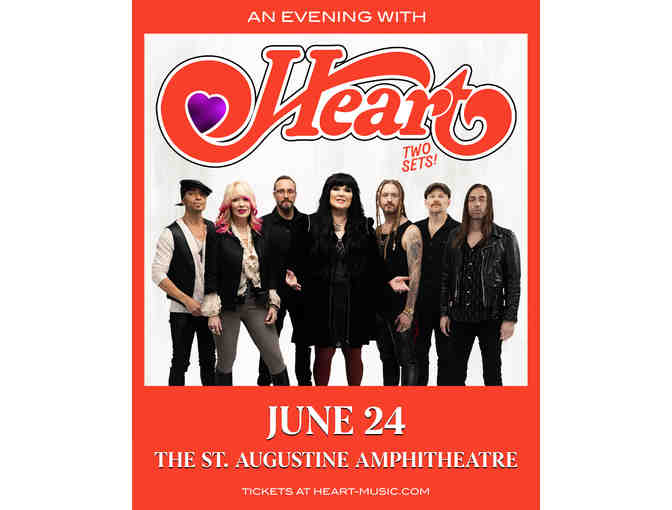 Don't miss your chance to win tickets to see the legendary rock band Heart live in concert on June 24th! Get ready for an unforgettable night filled with powerful vocals, iconic guitar riffs, and all the classic hits you know and love—from "Barracuda" to "Alone." This is your opportunity to experience one of the most influential rock bands ever in an electrifying live performance. Enter now to sing along, rock out, and make memories that will last a lifetime. Whether you're a longtime fan or new to their music, this is a concert you won't want to miss! Price includes VIP area and preferred parking!