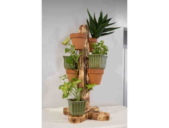 This handmade flowerpot stand is perfect for showcasing your favorite herbs, flowers, or succulents. Terracotta pots will fit perfectly in the slots. Crafted by a local artist, the stand features quality craftsmanship and attention to detail. It adds warmth to any porch, patio, or garden space, combining functionality and artistry.