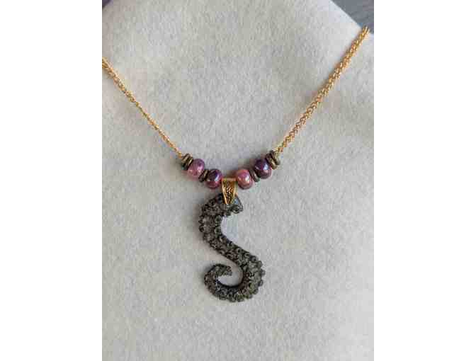 This necklace, by author and artist Jaym Gates, is a sneaky homage to the dark secrets beyond the cosmos. A curling, glittering resin tentacle reaches through a shimmering portal of iridescent ceramic beads and bronze hoops, looking for new worlds to conquer.
