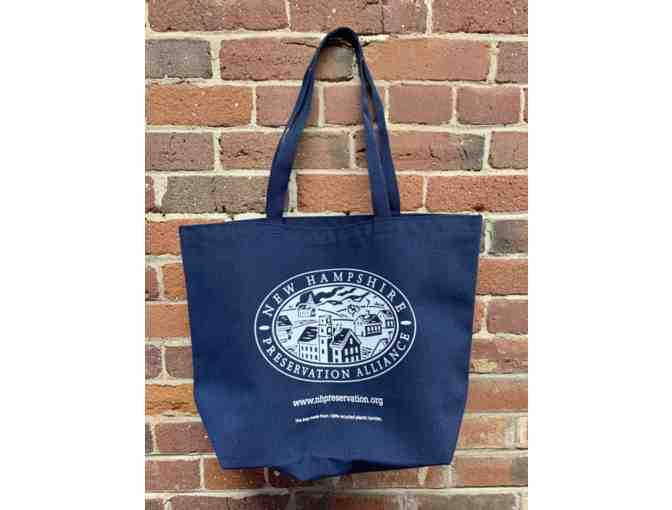 The New Hampshire Preservation Alliance Totebag is an EnviroTote "Bottle Bag" made of 100% post-consumer recycled PET (soda) bottles. Great handle and capacity. You know you want our swag!!