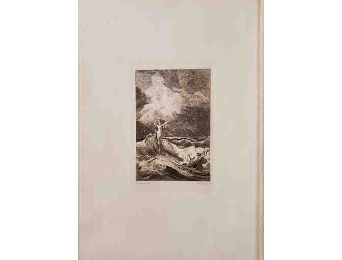 19th Century Engraving by Artist Friedrich Preller, 1804-1878 and Engraver Hans Meyer, 1846-1919, German. Titled Leukothrea Appears to Odysseus 19th century. "Fr. Preller," in script in lower left outside image within plate mark; "Hans Meyer," lower right corner outside image within platemark. Title and artist, etcher information on the reverse.