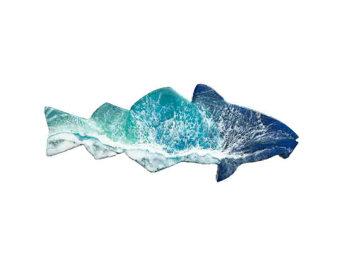 The cod that I designed for this year's auction is representative of the work that I do for my small business, The Sea By Me. The cod has been decorated with epoxy resin and mica pigment powders to create a gradation of blues and greens and crashing waves that we can see in our Atlantic waters.