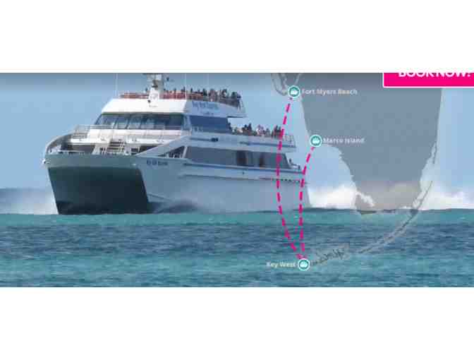 You are bidding on a voucher towards two roundtrip tickets aboard the jet-powered catamaran from Fort Myers Beach or Marco island to the destination spot of Pirates, Poets, Presidents, and Partgoers...Key West.