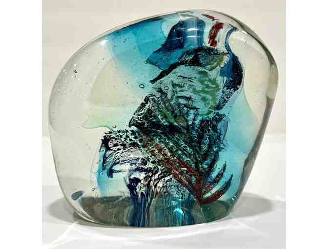 A beautiful glass paperweight designed by glass and jewelry artist, Joyce Roessler.