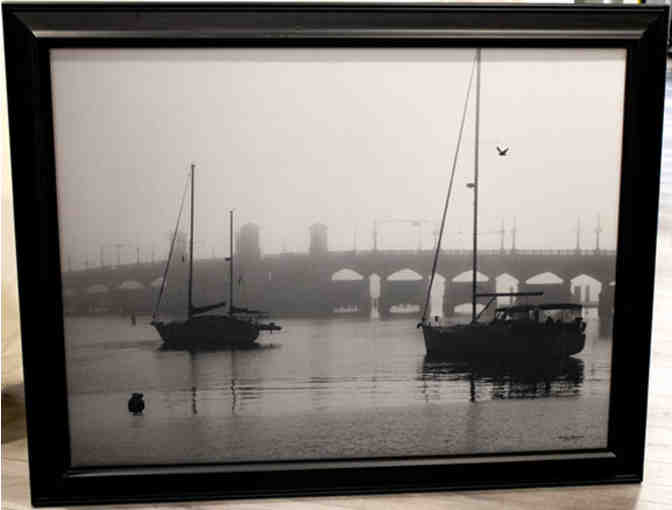 Sail boats with the Bridge of Lyons in the background, black and white, 40x30