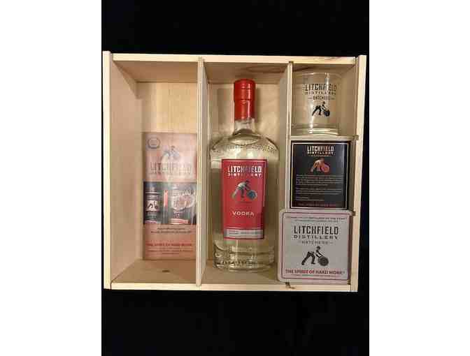 Beautiful "Gift Box" Set: Made in Connecticut - 750 ml Vodka + Glass + Coaster + Wooden Gift Box. (Distilled locally in Connecticut - and donated to us by the Litchfield Distillery.) Created from locally grown plants. This Vodka was a "Gold Medal Winner" 2018 & 2019 at the New York International Spirits Competition and "Silver Medal Winner" at the 2017 San Francisco World Spirits Competition! This Gluten-Free Vodka is distilled from corn grown in Somers, CT. It is distilled 4+ times through a gravity-fed filter to remove impurities and create an incredibly smooth taste. Bottled at 80 proof (40% Alcohol). Taste is impeccably clean and slightly sweet, with sweet buttery overtones. By CT Law, this Vodka cannot be shipped (sorry!) but can be picked up FREE in Enfield, CT by Winning Bidder at the end of the Auction. This is a GIFT BOX SET: it includes the Handmade Wooden Box (13.5" x 12.5" x 4.5") plus a beautiful "Litchfield Distillery" Glass.