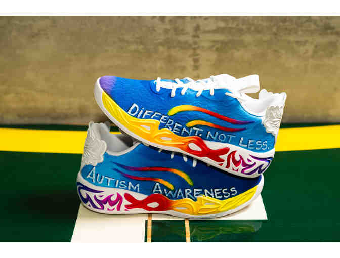 These shoes highlight Autism Awareness, as an issue that Skylar is passionate about. The design features a blue base with yellow, orange, red and purple flame like designs. The words "Autism Awareness" are written across the outside of one shoe and the words "Different, Not Less" are written across the outside of the other shoe.