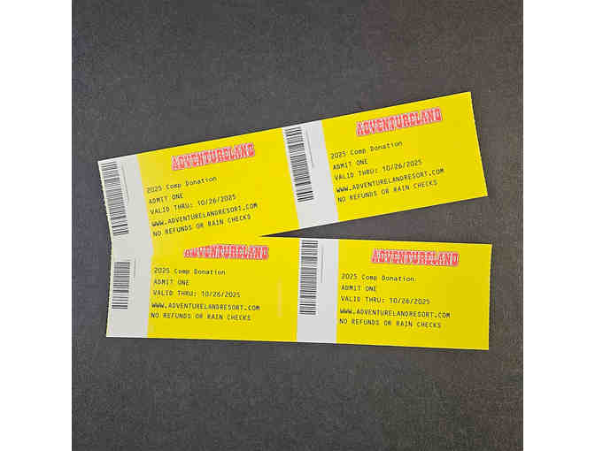 Enjoy 4 park admission passes good for both Adventureland and Adventure Bay Water Park—fun for the whole family!