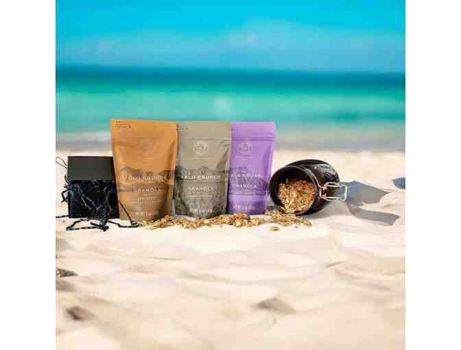 Hawaiian Krunch Granola's signature base granola of organic oats, local niu, local raw honey, paakai, macadamia nuts, and various seeds were created to compliment the use of these four canoe crops.
