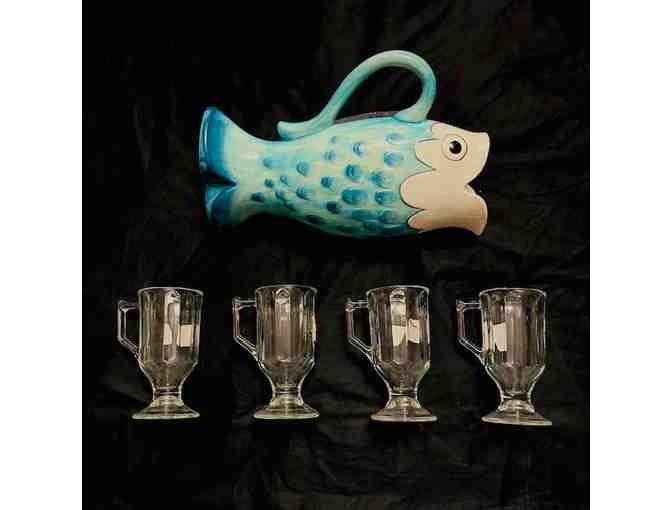 Enjoy the Ocean year-round! 5 pieces total: you won't find this anywhere else. Whimsical Ceramic "Fish Pitcher" is beautiful teal and white colored, with a handle for pouring. (Pitcher size is 12.5" H and 9" wide.) This set also includes 4 sturdy/solid (and matching) "teal-tinted" glasses with handles (Size 6" x 4.5"). So unique! Item may be shipped nationwide to Winning Bidder (with insurance) - or may be picked up for FREE in Enfield, CT. Such a FUN item!