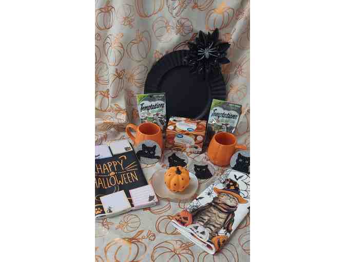 This set has yummies for you and your kitty! Caramel Crème Coffee Pods- 2 pumpkin mugs, 4 jeweled coasters, decorative charger, pumpkin, dish towels and Temptations treats!