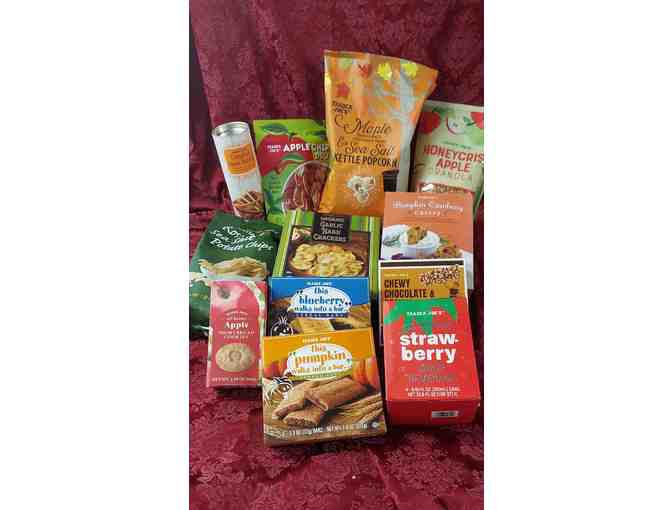 A tasty selection of treats from Trader Joe's including cookies, chips, popcorn, granola bars, juice and more!