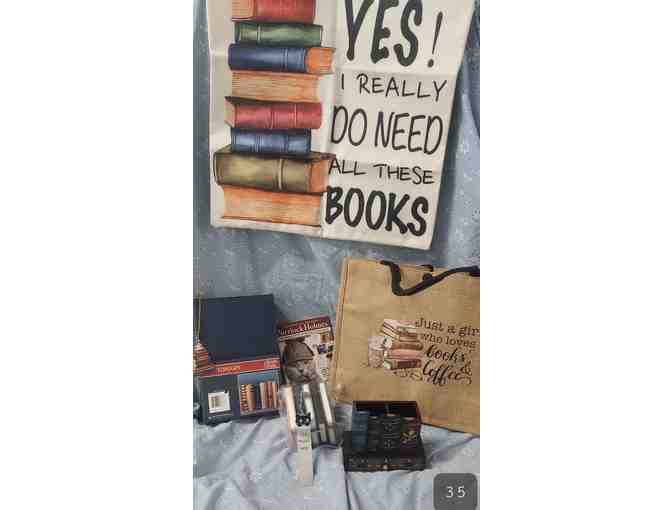 A book lovers feast! Burlap carry bag and tote 14"x12"x5", linen pillow cover 17"x17", set of 5 lined mini journals 3"x4.5", ornament, bookmark, "Purrlock Holmes" puzzle book, metal book safe 6.1"x2.1"x9.5", soft book throw 40"x60" and delightful book accessory with drawer