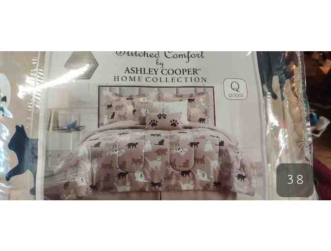 Sleep with the kitties with this full/queen comforter set! Has an 86"x86" comforter, 2-20"x26" shams, 60"x80" 14" drop bed skirt and 3 decorative pillows. Machine washable.
