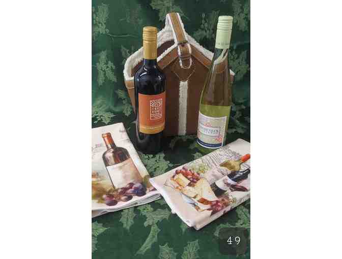 1 bottle of Gooseneck Vineyards Wickford White and 1 bottle of Treefort Cabernet Sauvignon in a rustic tote with 2 wine themed towels. NO SHIPPING