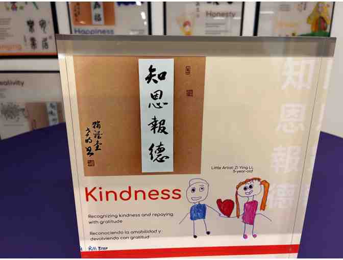 Created by Zi Ying Li, age 5, this artwork beautifully captures the joy of giving and receiving kindness. The traditional Chinese calligraphy, paired with a child’s heartfelt drawing of two friends sharing love, reminds us that kindness is both simple and transformative. Through bright colors and smiling faces, Zi Ying illustrates a timeless truth: that gratitude and compassion connect us all, no matter how small the gesture.
