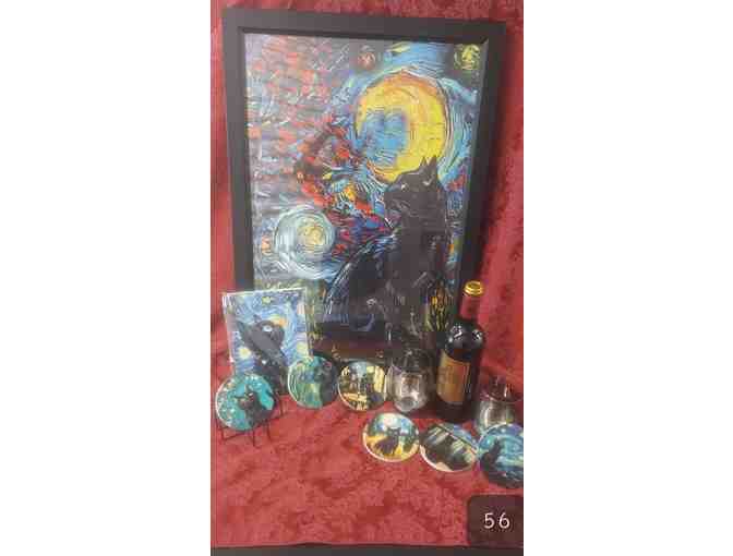 This beautiful rendition of "Starry Night" with cat (16"x28") and this 6pc. coaster set featuring cats with other Van Gogh masterworks will transport you to Arles as you sip this French Trintaudon Bordeaux from these trendy stemless wine glasses. Matching notebook included. NO SHIPPING ON THIS ITEM