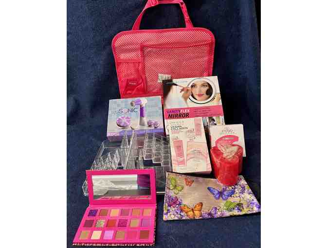 Refine your beauty routine with these helpful items. 2-make-up holders, 1-butterfly pouch, 1 travel make-up bag, Vanity flex mirror, Epi-Sonic Professional Skin Care System, 1-Pacifica vegan collagen skin care kit, 1-box of Micellar cleansing pads and a heart candle.