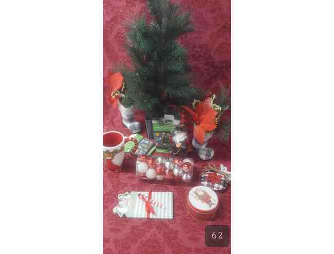 Get in gear for the holidays with these items to start your decorating journey. A 2' Christmas tree and 24 mini ornaments, Christmas mug, decorative Santa, Xmas shopping list pad, 2 Christmas Brew Buddies, cranberry candle and 2 Santa boots décor pieces. NO SHIPPING ON THIS ITEM