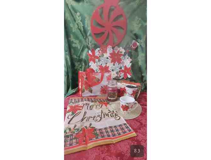 Red silver and gold are the colors to build on in this Christmas décor assortment. 18"x13" embroidered mat, 15" round mat, 4-8"x12" red felt placemats, Red Berry Yankee Candle, small poinsettia carry bag and 2 poinsettia mugs in a decorative box.