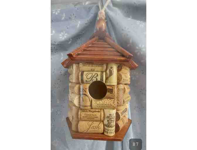They can peacefully coexist! This delightful decorative birdhouse is made by craftsperson Julie Corsi from repurposed corks. It is 12"H. It will look stunning paired in your garden with this 33" brass toned wind chime with 7 cats!