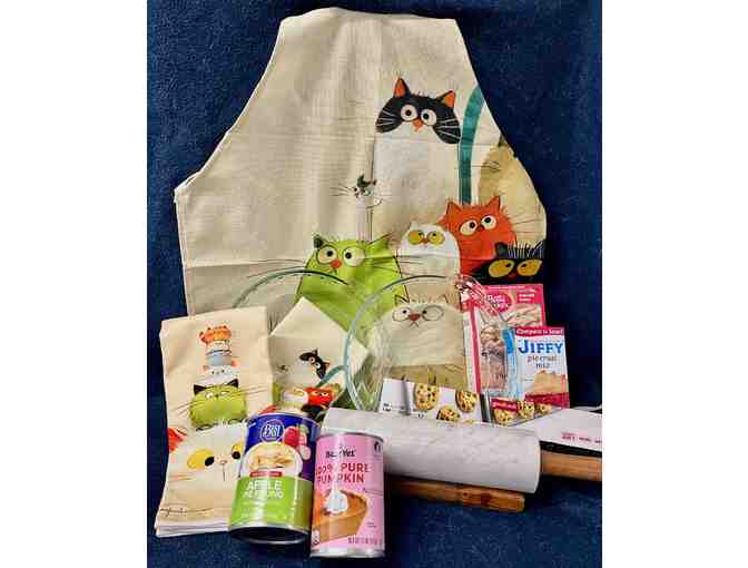 It's the time of year when all thoughts turn to pie. Turn your oven on and let's get baking! Deluxe 10" marble rolling pin with stand, 2- Pyrex 9" pie plates, 2 boxes of pie crust mix, apple and pumpkin fillings, parchment paper and a "Curious Kitties" towel and apron set.