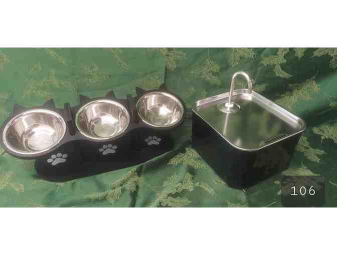 Playful 3 dish food station with 2 levels for comfort and an electric pet water dispenser with stainless steel top so your cat always has fresh water.