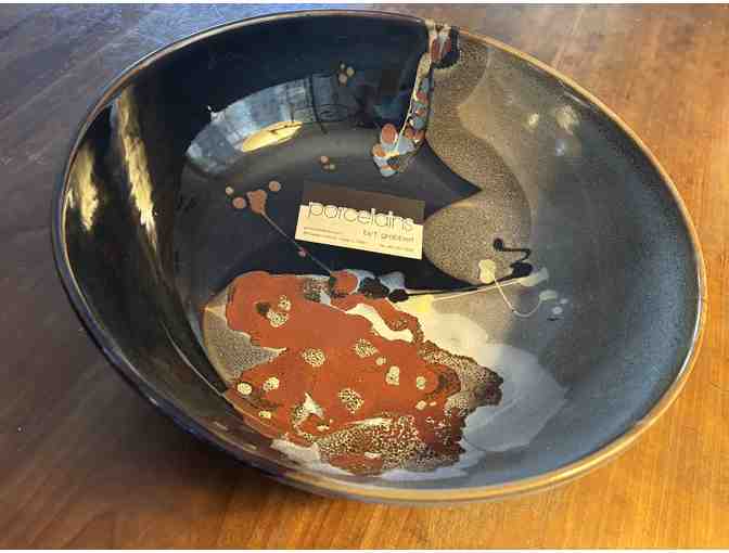 This gorgeous handcrafted bowl/platter from ceramic artist Tom Grabbert in Hope, RI, is 14"in diameter and 4" high. Tom has developed a unique palette of natural rich toned glazes that compliment the forms of his work and suggest movement and tranquility.