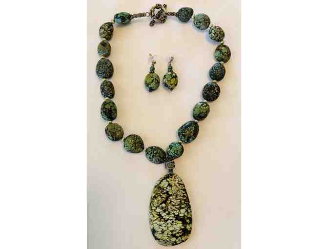 Truely remarkable “Snakeskin” Tibetan Turquoise necklace with green pearl spacers, and matching earings. Creative and artistic silver toggle is as unique as the piece itself.
